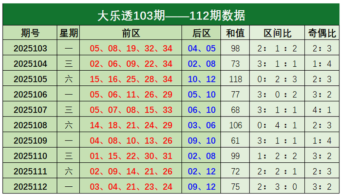 大乐透第2025112期出奖号统计:前区03、04、21、23、24,后区09、12。和值为75,区间比为2:3:0,奇偶比为3:2。