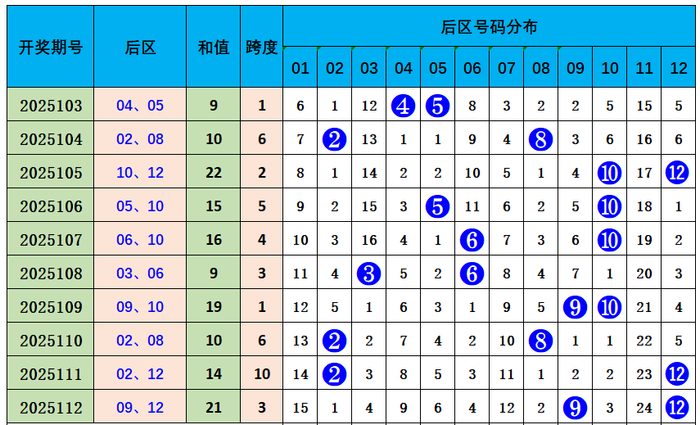 上期奖号开出09、12。最近10期开出大奖号11枚,小奖号9枚,大小比为11:9,本期预测开出大小比为1:1,推荐后区奖号:06、12。