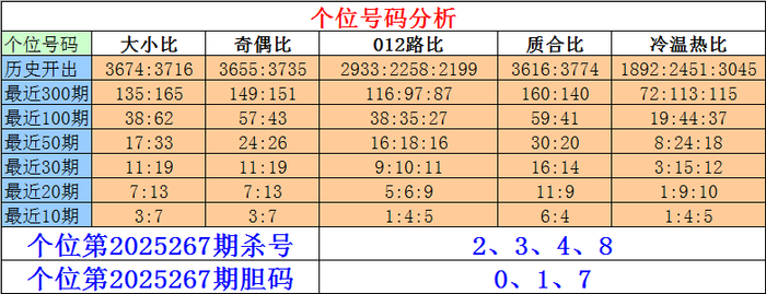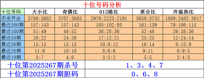 近期十位偶数表现较冷,最近4期连出,开始走热,本期预计再出;该位温冷号码近期出现较少,目前轮空1期,本期防温冷号码再次解冻。十位杀号:1347,胆码关注:068。
