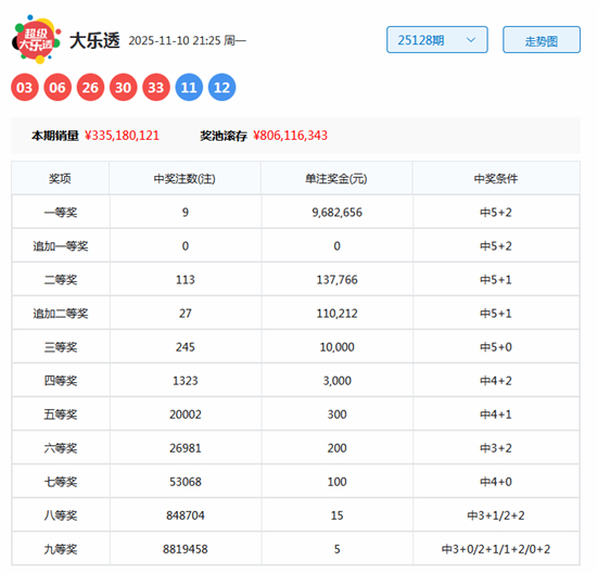 大乐透第2025128期开出奖号为:03、06、26、30、33+11、12。其中前区奇偶比为2:3,三区比为2:0:3,大小比为3:2,后区开出一奇一偶组合。