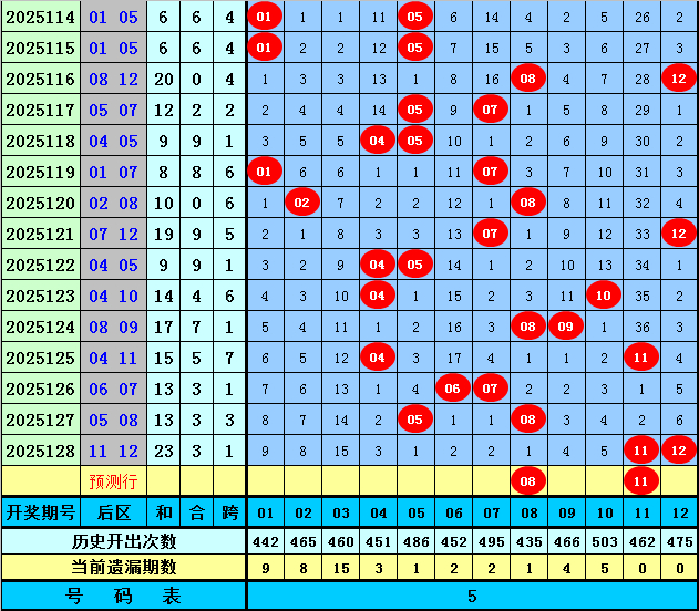 后区第二位推荐:在连续5期开奖中分别出号:09、11、07、08、12,均值为9.4,其中奇数奖号表现相对较热,本期没有转冷的迹象,注意再次出现,关注号码11。